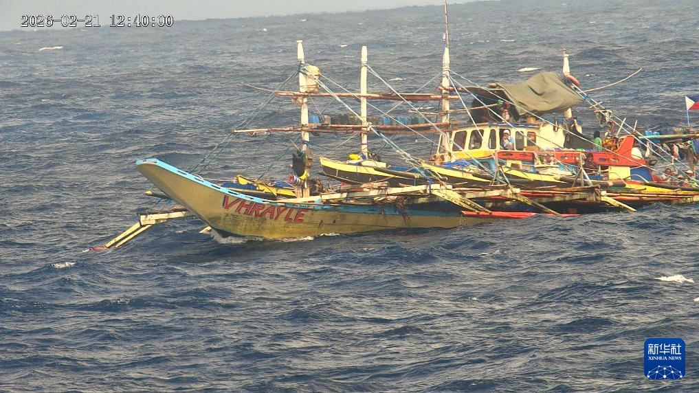 2月21日,菲律宾多艘船只集结侵闯我黄岩岛领海,被我海警万山舰编队依法驱离。这是菲船只在冲闯我黄岩岛领海,其中一名船员疑似在拍摄我海警舰艇。