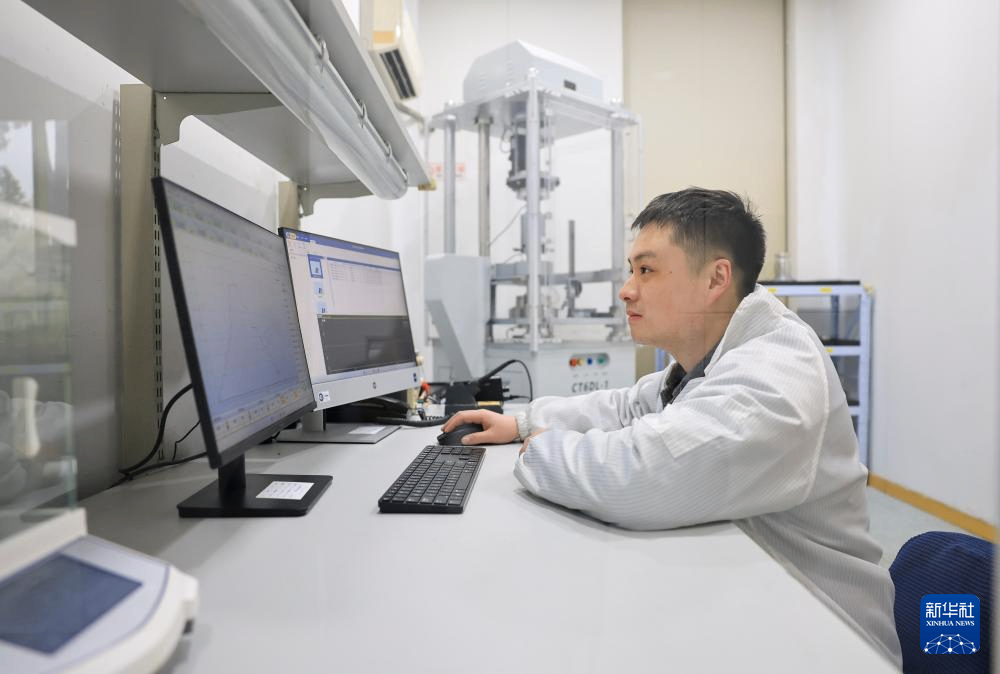 3月16日,在江苏靖江经济技术开发区,江苏东华测试技术股份有限公司实验人员对研制的某款机器人用六维力/力矩传感器进行程控检测。