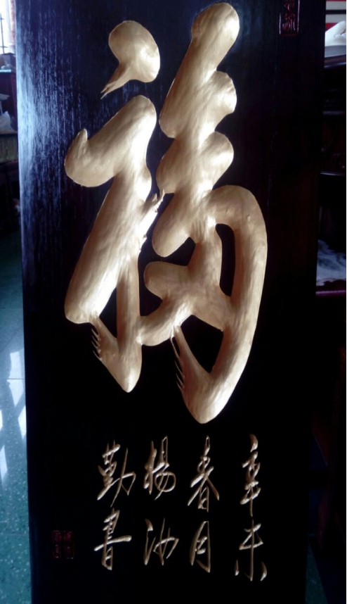 杨先生说自己的太爷爷、爷爷、父亲都擅长写这个福字,自己又受到了恭王府之行的启发,更奠定了自己与福字的缘分。说到这杨先生从柜子里拿出来一件东西,包裹得里三层外三层,最终打开之后是一个福字,说是自己爷爷留下来的,是雕刻出来的字体,真是与恭王府石碑上的福字太像了。