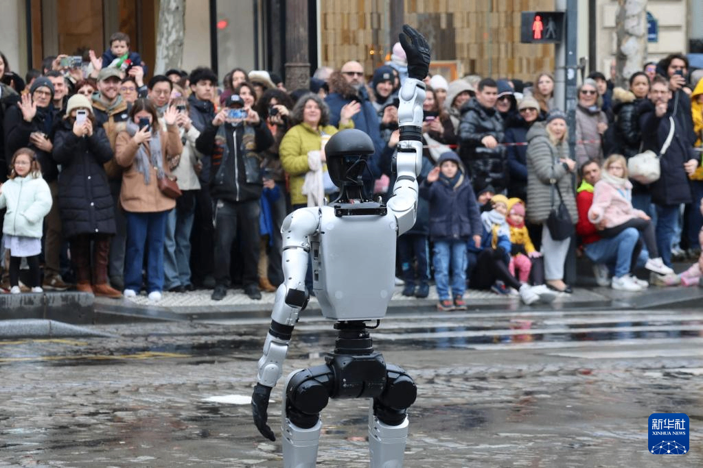2月1日,在法国首都巴黎的香榭丽舍大街,由宇树科技及其法国代理INNOV8集团提供的机器人在巡游活动上向观众挥手致意。