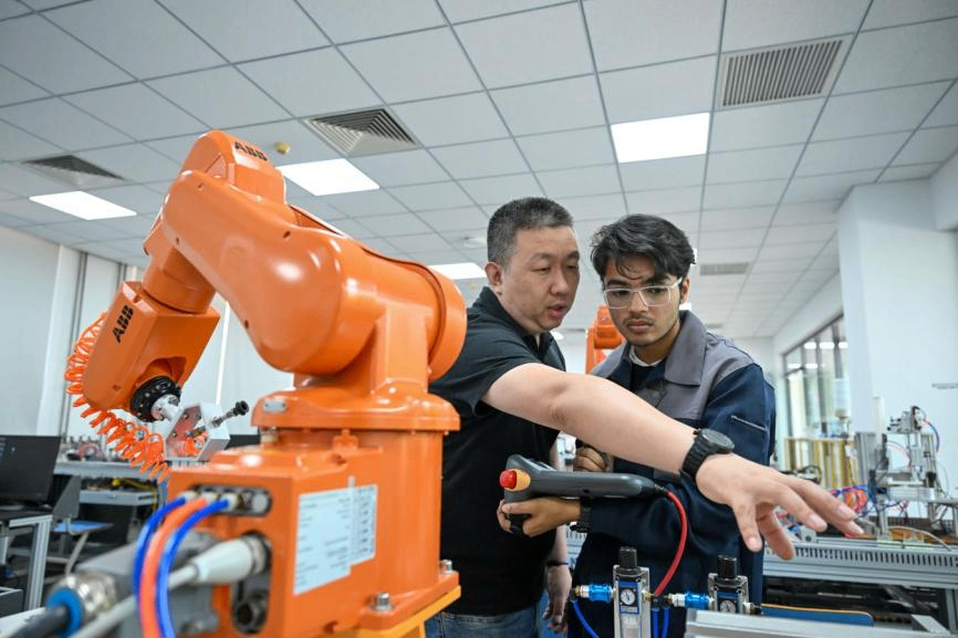 2025年6月16日,在天津现代职业技术学院鲁班工坊实训教室,巴基斯坦留学生木衫(右)在老师指导下操作自动化设备。(记者 孙凡越 摄)