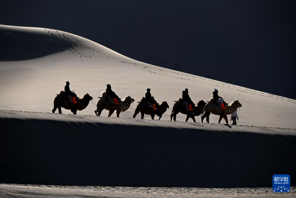 12月1日,游客在甘肃省敦煌市鸣沙山月牙泉景区游览。