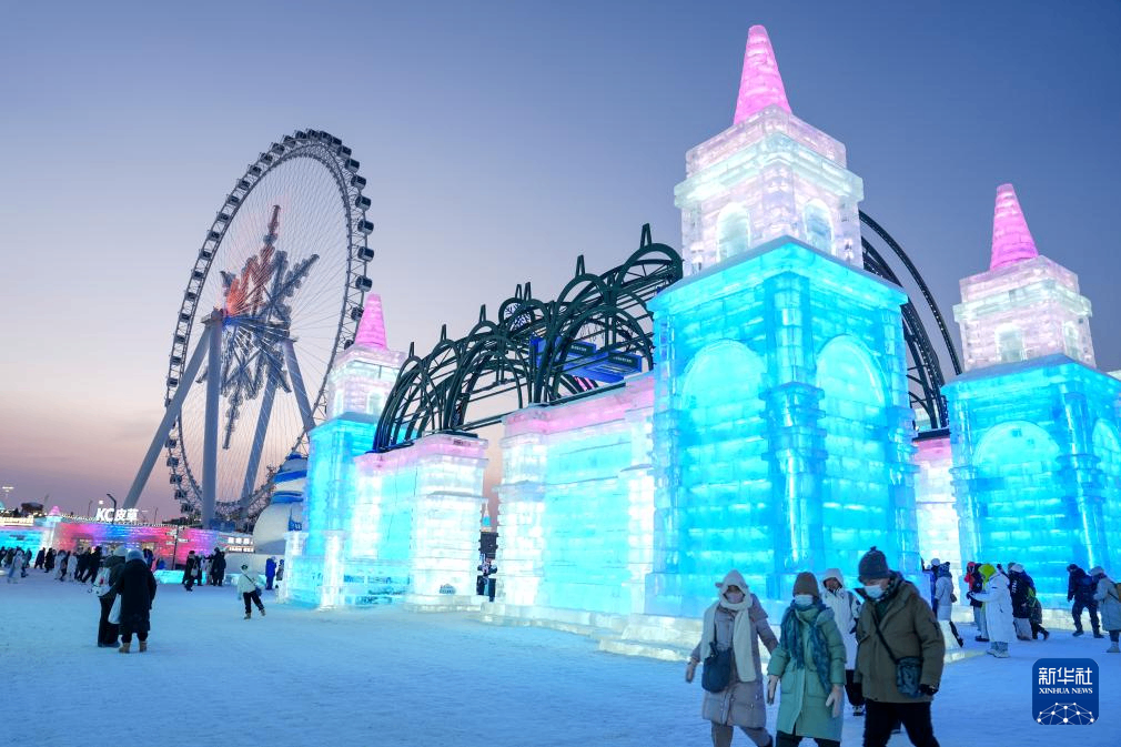 寒冬时节,哈尔滨冰雪大世界园区流光溢彩,吸引了来自天南海北的游客观赏游玩,畅享冰情雪趣。