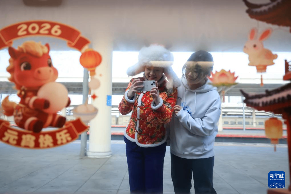 3月1日,旅客在齐齐哈尔站站台上拍摄G1280次列车上的元宵节装饰。