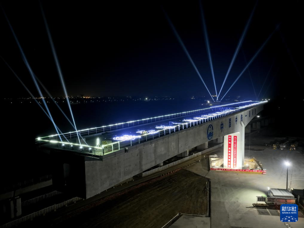 1月16日凌晨,沪宁合高铁跨京沪高铁立交特大桥201.5米预应力混凝土T构转体梁在转体施工中(无人机照片)。