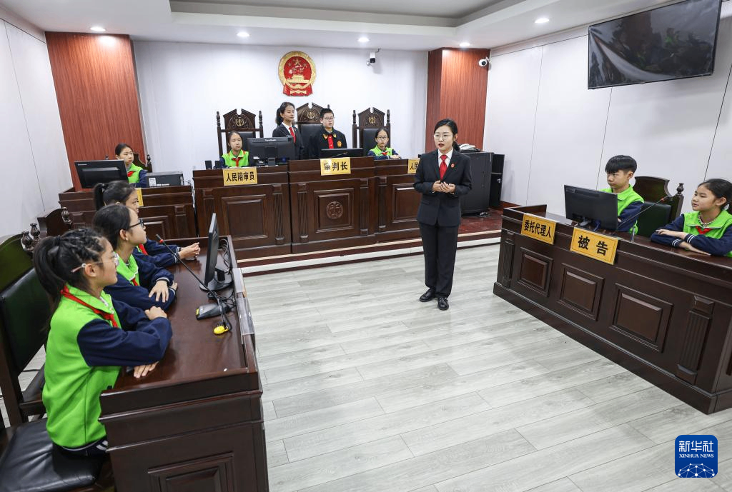12月2日,在山东省荣成市人民法院民事审判庭,法院工作人员指导学生沉浸式体验“模拟法庭”。