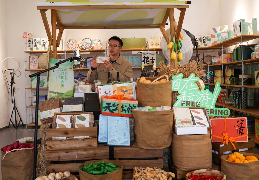 11月21日,在江苏省兴化市千垛镇东罗村,网上销售直播人员介绍当地特色农产品。(史道智摄)