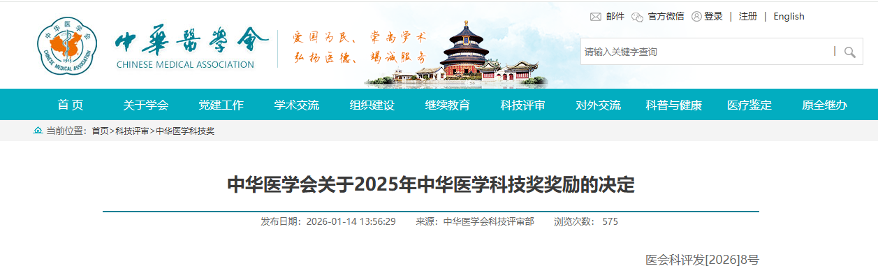 根据《中华医学科技奖管理办法》(医会科评发[2024]70号)规定,经中华医学科技奖评审委员会专家评审并报请中华医学会第26届理事会第29次常务理事会会议审议确认,中华医学会决定对2025年中华医学科技奖获奖项目(附后)进行奖励: