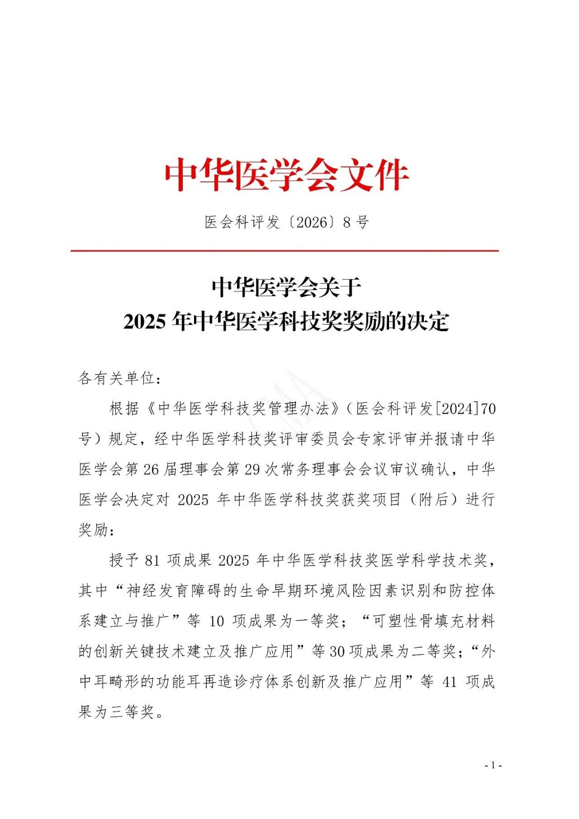授予81项成果2025年中华医学科技奖医学科学技术奖,其中“神经发育障碍的生命早期环境风险因素识别和防控体系建立与推广”等10项成果为一等奖;“可塑性骨填充材料的创新关键技术建立及推广应用”等30项成果为二等奖;“外中耳畸形的功能耳再造诊疗体系创新及推广应用”等41项成果为三等奖。