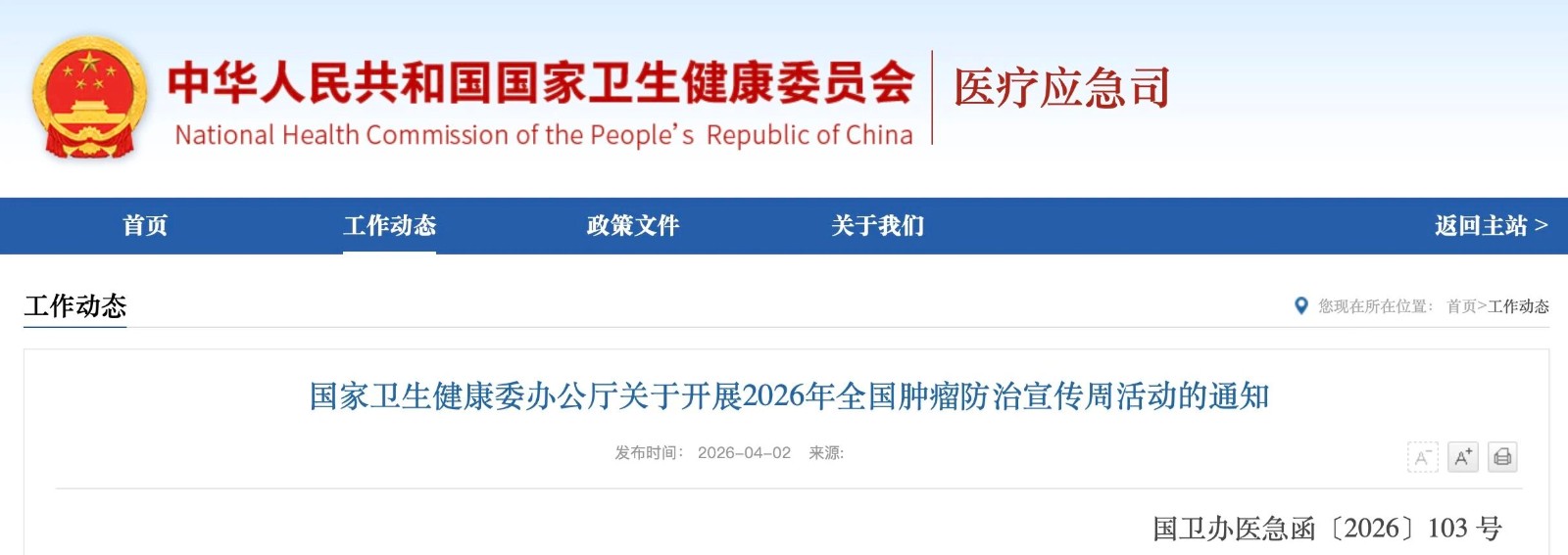 国家卫生健康委办公厅关于开展2026年全国肿瘤防治宣传周活动的通知