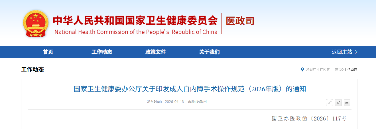 为进一步提高白内障手术规范化水平,保障医疗质量安全,维护患者健康权益,我委组织制定了《成人白内障手术操作规范(2026年版)》。现印发给你们(可在国家卫生健康委网站医政司栏目下载),请各地卫生健康行政部门组织做好实施。