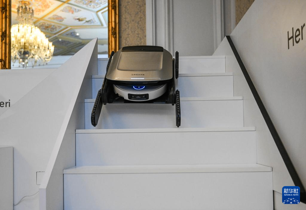 4月15日,在土耳其伊斯坦布尔举行的追觅科技智能家居产品发布会上,一台扫地机器人演示下楼梯。