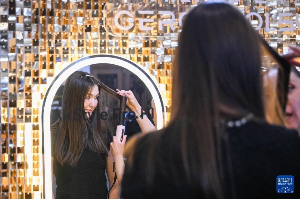 4月15日,在土耳其伊斯坦布尔举行的追觅科技智能家居产品发布会上,嘉宾体验智能温控美发棒。