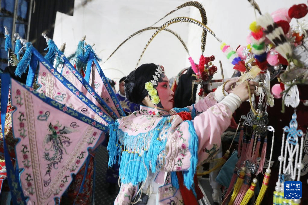3月7日,演员在河南省焦作市温县武德镇村文化中心候场时整理道具。