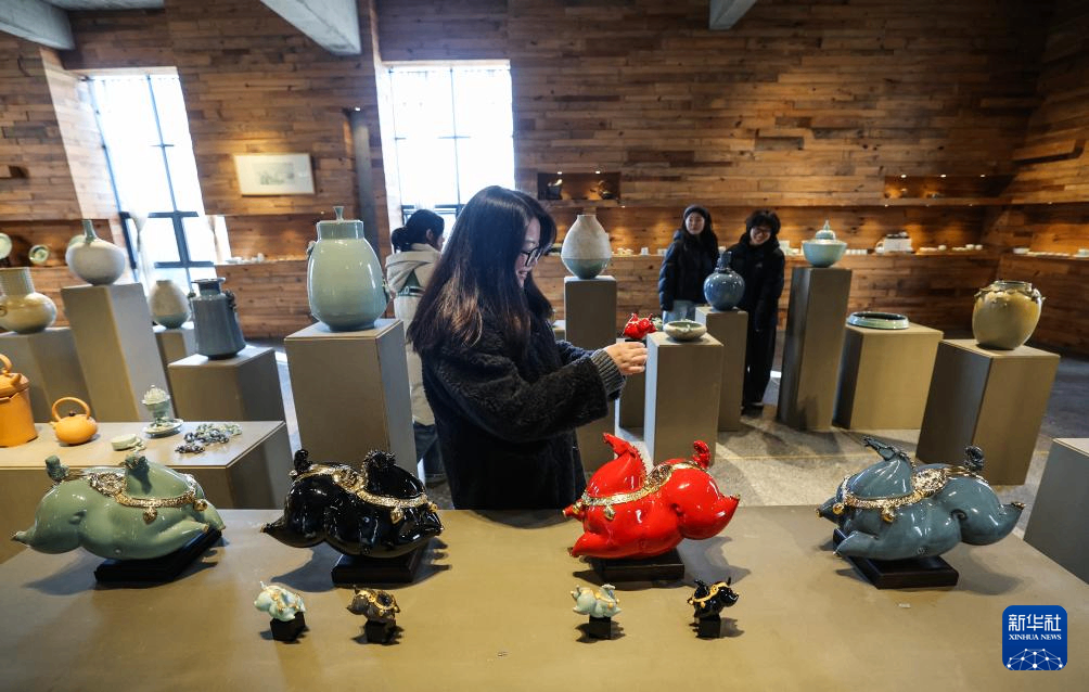 1月8日,游客在金华市金东区古婺窑火陶瓷文化艺术馆里欣赏马年陶艺“福马乾坤”。古婺窑火陶瓷文化艺术馆是以婺州窑为核心打造的文旅融合景区,包含陶瓷制作车间、婺州窑展厅及博物馆等区域。