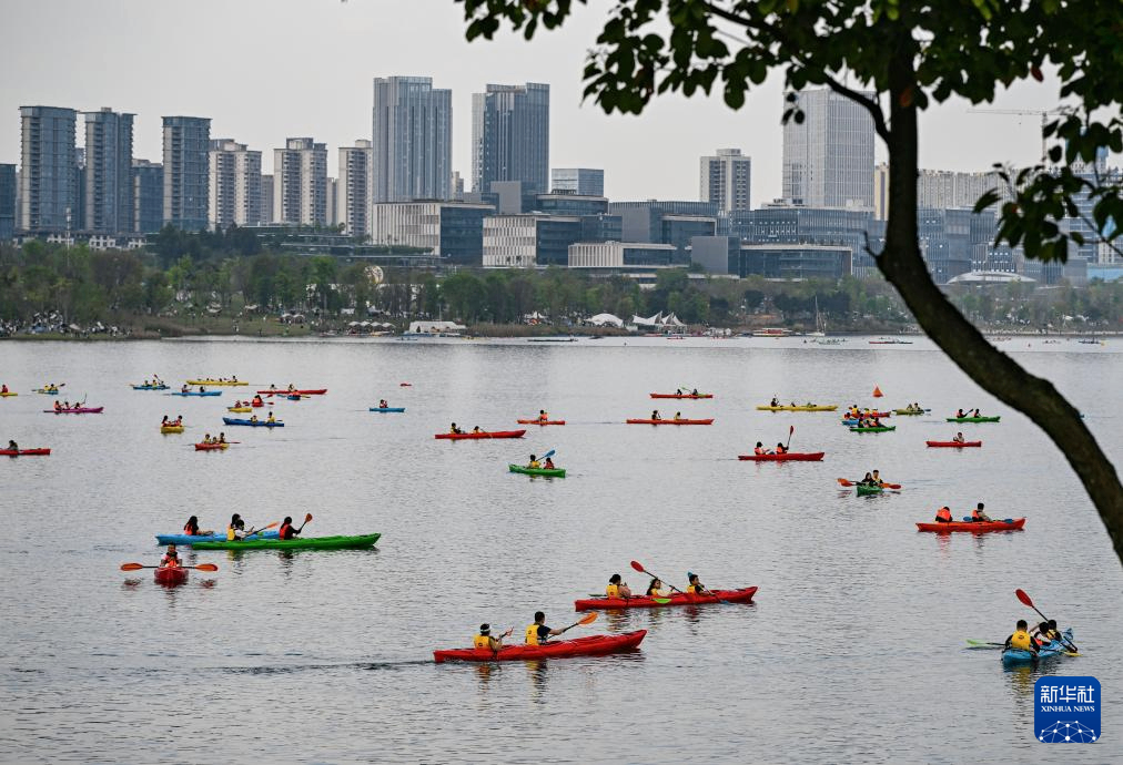 4月4日,游客在四川天府新区兴隆湖体验皮划艇运动。