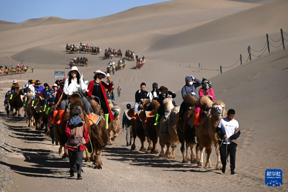 4月5日,游客在甘肃省敦煌市鸣沙山月牙泉景区骑骆驼游览。