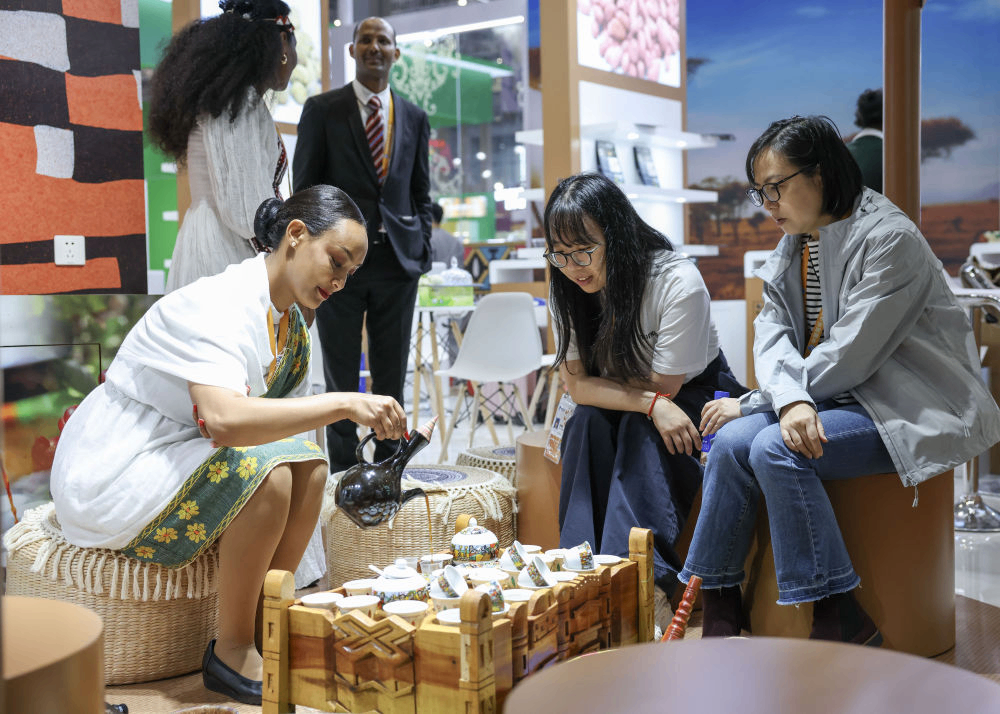 2025年11月7日,人们在第八届进博会国家展埃塞俄比亚馆品尝咖啡。记者 孟晨光 摄