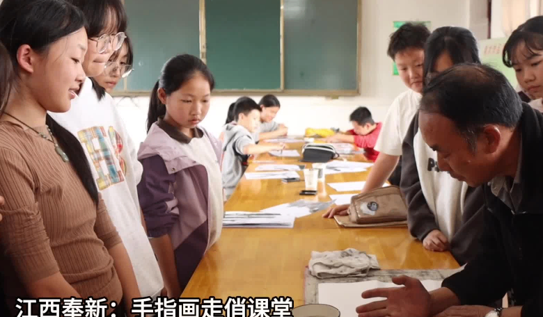 近年来,在江西省奉新县干洲镇,手指画受到当地学生的青睐。手指画以推、压、按、行、点为技法,用指尖作笔,将田间稻穗,溪边卵石等乡土元素融入画中。